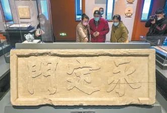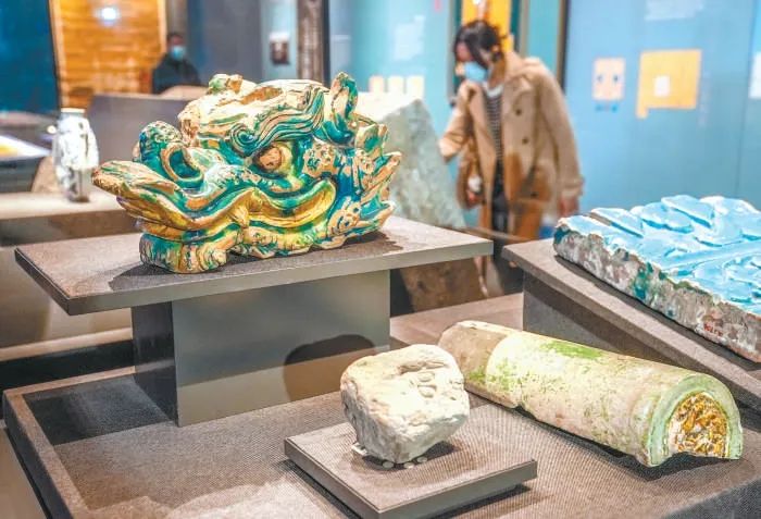 “辉煌中轴”展上陈列的元代吻兽、宫字残砖等建筑构件及明代永定门石匾。