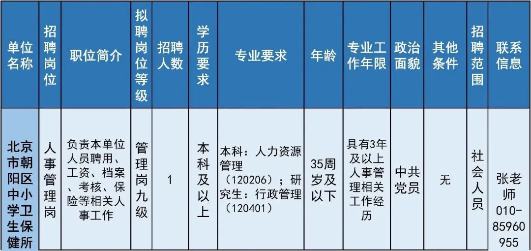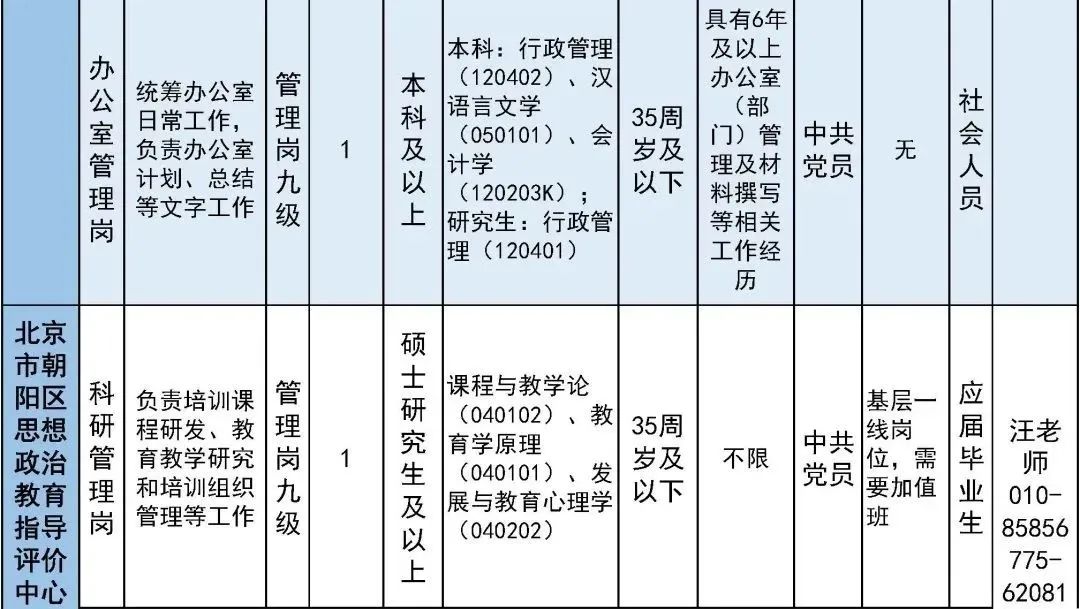 根据《北京市朝阳区2023年度事业单位面向社会公开招聘工作人员公告》,中共北京市朝阳区委教育工作委员会、北京市朝阳区教育委员会面向社会招聘9名事业单位工作人员,招聘岗位如下: