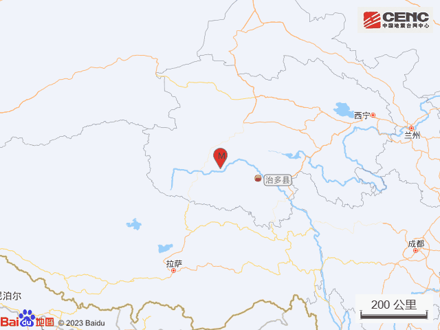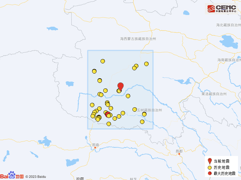 历史地震:根据中国地震台网速报目录,震中周边200公里内近5年来发生3级以上地震共46次,最大地震是2022年8月14日在青海玉树州杂多县发生的5.9级地震(距离本次震中164公里),历史地震分布如图。