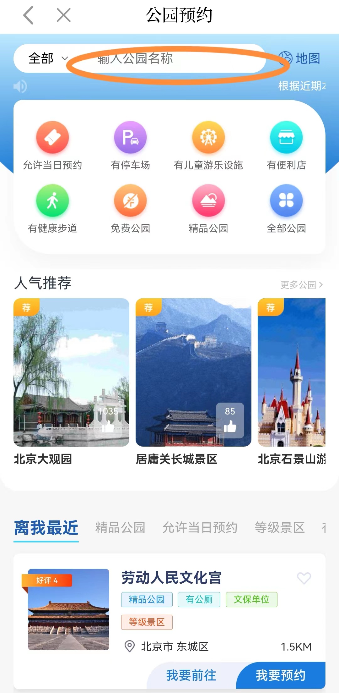 进入小程序后,您既能搜索自己心仪的公园并预约游园时间,也能按是否有健康步道、便利店、停车场等条件进行公园查询和筛选。