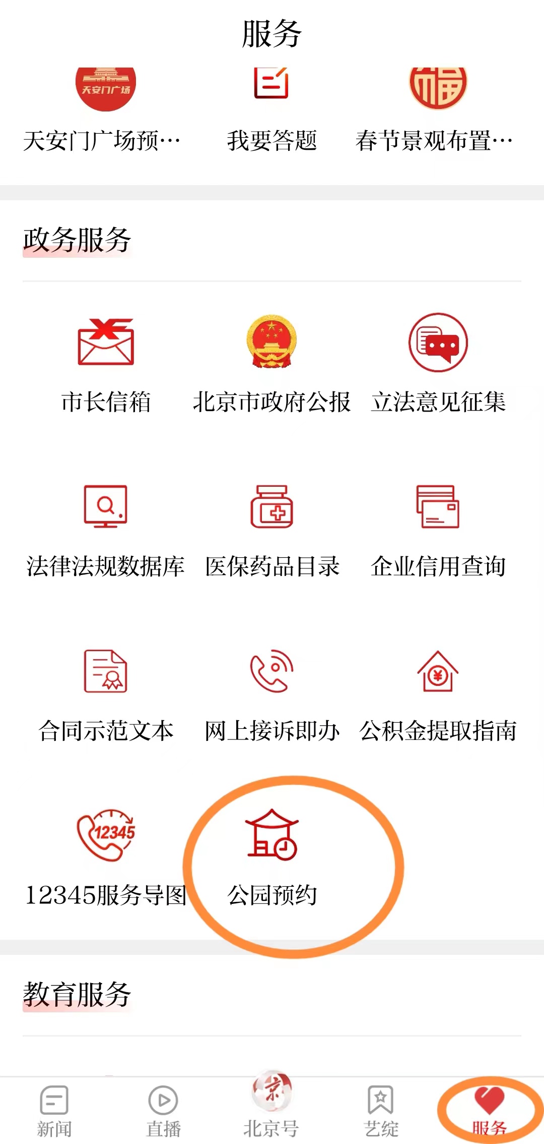 点击“政务服务”中的“公园预约”。