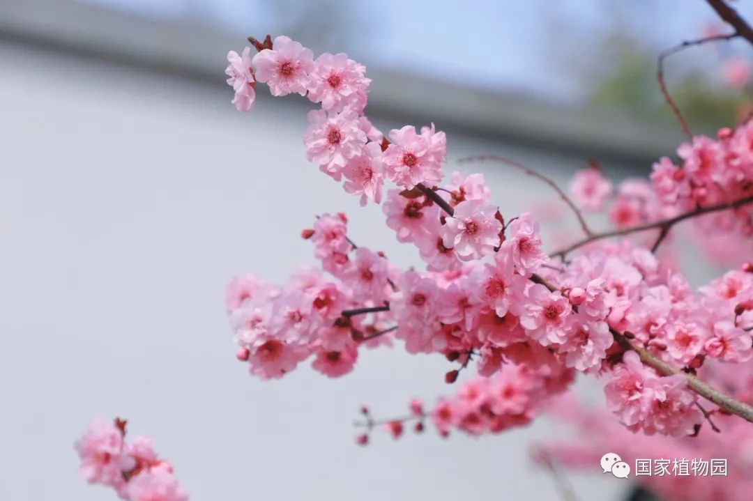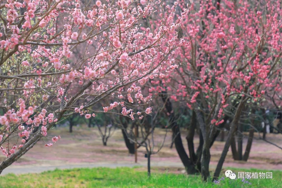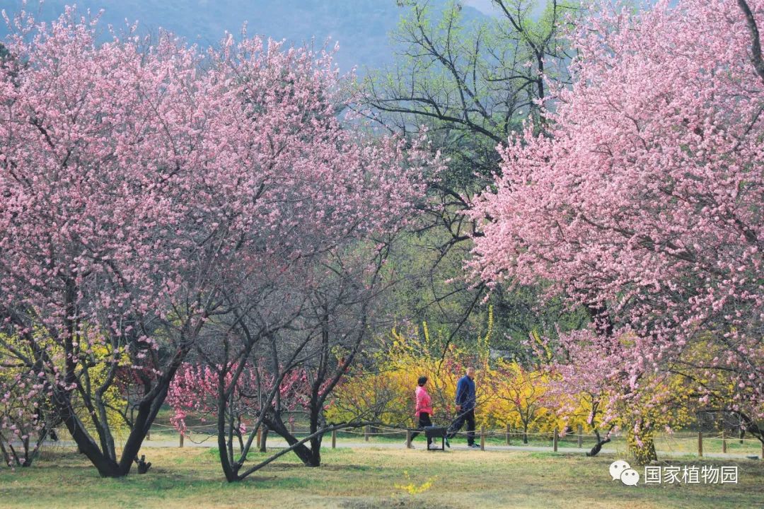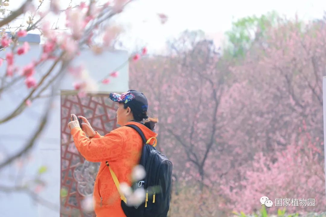 梅园中的梅花也肆意开放,盛放的梅花氤氲开来,远远望去像山间四散的粉色云霞,将满园的春色渲染得更加浪漫。'美人'梅陆续进入观赏期,粉嫩的花色亮红的叶色都成为一道独特的风景,预计下周将进入盛花期,国家植物园北园东南门周边、梅园栈道周边等多处均有'美人'梅栽植。