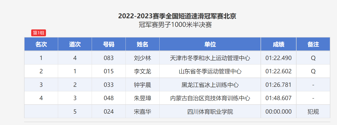 4月2日,在首都体育馆举行的全国短道速滑冠军赛男子1000米半决赛中,来自天津队的刘少林以1分22秒490的成绩获得小组第一,这一成绩同时也打破了该项目的全国纪录。此前,这一纪录是由韩天宇在2018/19 赛季短道速滑世界杯盐湖城站上创造的1分22秒494。