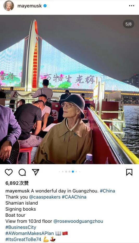 梅耶·马斯克3月21日在Instagram上发布了自己乘船夜游珠江等多张照片。
