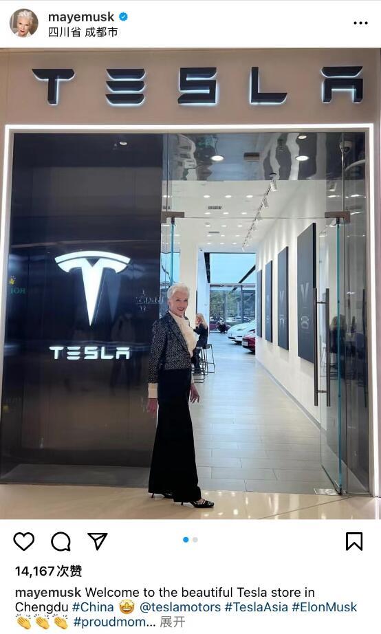 梅耶·马斯克3月25日在Instagram上发布自己与特斯拉成都门店的合照。