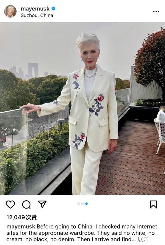 梅耶·马斯克3月27日在Instagram上发布自己身穿中国品牌鄂尔多斯西装的照片,她的背后出现了苏州地标东方之门。