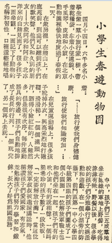 据本报1955年4月16日2版《小学生春游动物园》报道,6000多名小学生像一群小旅行家一样,带着干粮袋,拿着小望远镜、小手风琴、皮球和小鼓,在北京动物园里愉快地度过了一天。在儿童运动场上,很多孩子脱掉外衣,兴高采烈地荡秋千、滑滑梯,一个个满头大汗,晒得小脸红红的。中午,孩子们三五成群地坐在草地上野餐,吃得津津有味。野餐后,孩子们又参加了各种文娱和游戏活动。