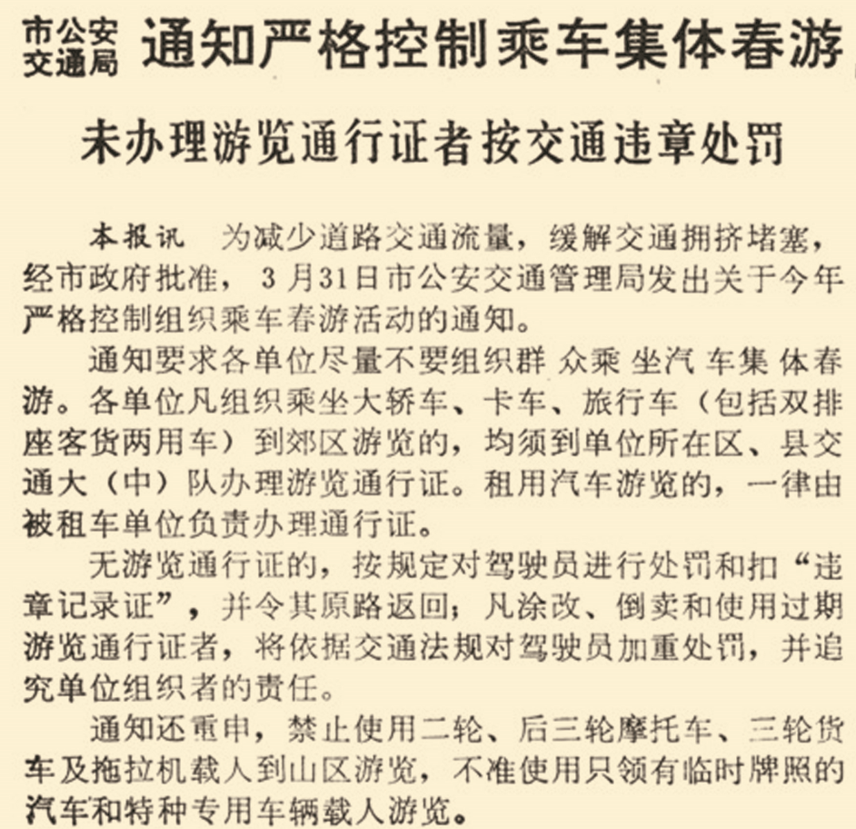 由于各单位组织的春游活动逐年增多,时间大都集中在四五月份,而一些游览地区沿途道路狭窄,停车场容量又有限,经常造成交通拥堵,甚至发生交通事故,为此,1983年,市政府办公厅发出紧急通知,要求各单位一般不要派车组织春游活动。凡组织职工乘坐大轿车、旅行车去八达岭、十三陵、潭柘寺、颐和园、香山、八大处、北海公园、中山公园等地游览的,一律要到交管部门领取春游车证,交管部门按照实际情况从严发放车证。(1983年4月9日《北京日报》1版,《各单位一般不要派车组织春游》)