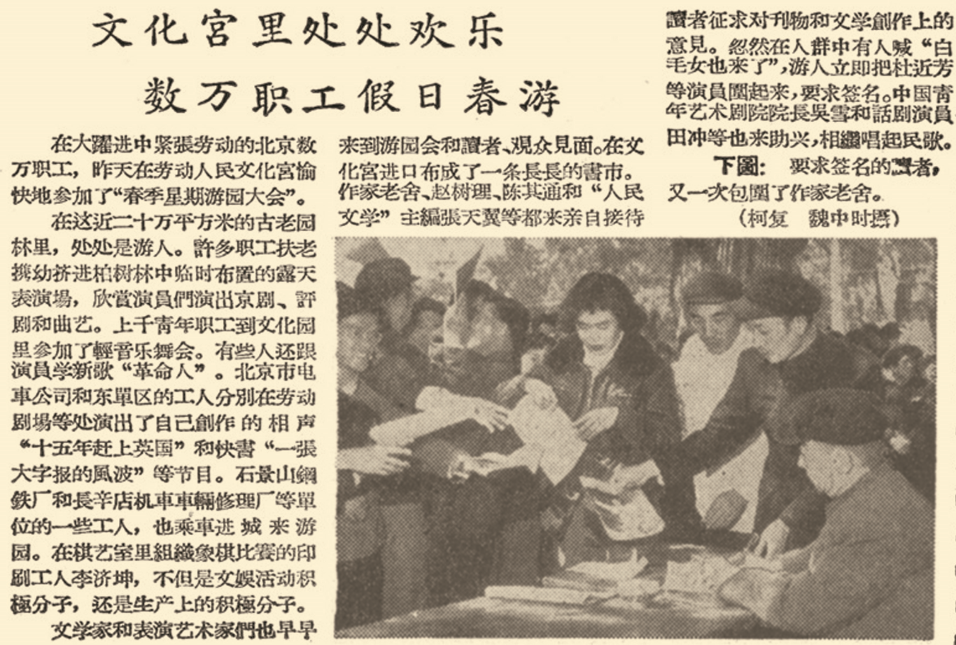 由于公共交通不够发达,城里的公园因为路途较近最受人们青睐,劳动人民文化宫便是春游的最佳选择之一。据本报1958年4月14日1版《文化宫里处处欢乐 数万职工假日春游》记载,近20万平方米的古老园林里,处处是游人。许多职工扶老携幼挤进柏树林中临时布置的露天表演场,观看京剧、评剧和曲艺演出。上千青年职工参加了轻音乐舞会。石景山钢铁厂和长辛店机车车辆修理厂等单位的一些工人,也乘车进城来游园。