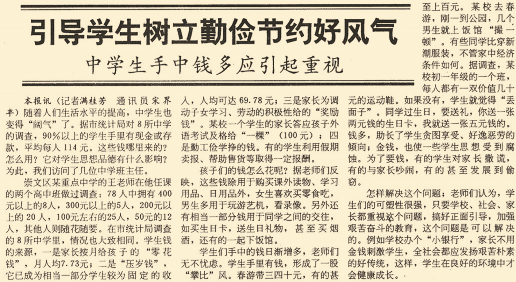 上世纪八九十年代,中小学生在春游中爱花钱的现象引发关注,很多学校开展了节约教育,老师们也呼吁家长少在孩子吃喝穿上破费,多给孩子些精神食粮。