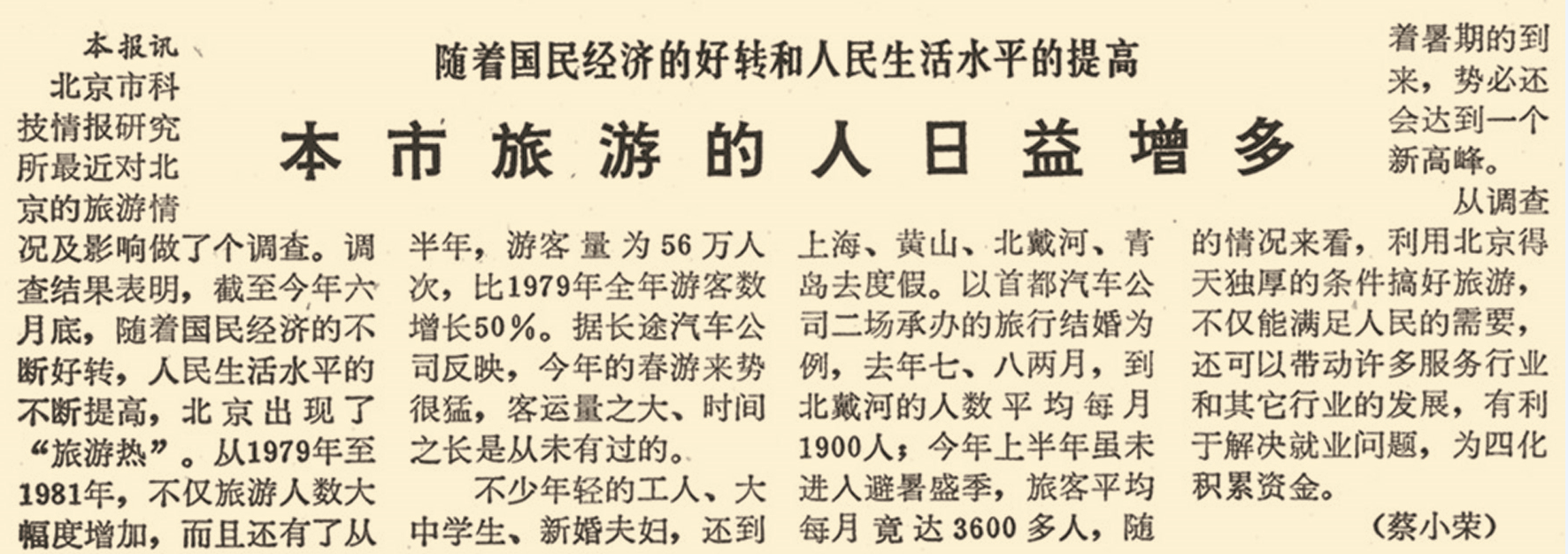 上世纪80年代,旅游业兴起,北京迎来春游高峰,有单位组织的集体春游已达到百人以上,仅1981年上半年,游客量就达到56万人次,比1979年全年游客数增长了50%,春游来势之猛、客运量之大、时间之长是从未有过的。(1981年7月14日《北京日报》1版,《本市旅游的人日益增多》)