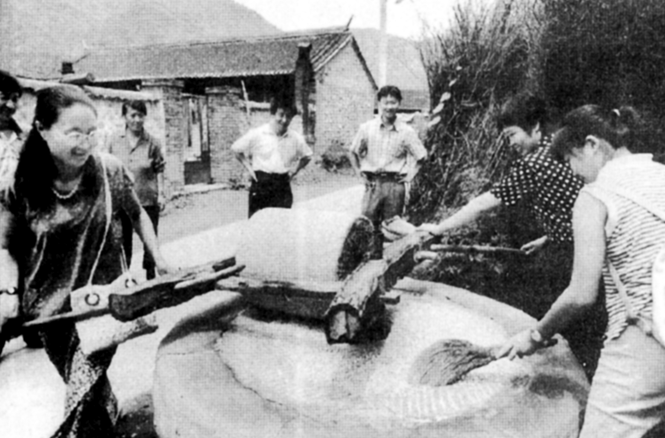 上世纪90年代,春游流行住农家院、吃农家饭、干农家活、享农家乐。图为游客在密云遥桥峪村推石碾子。李士炘摄