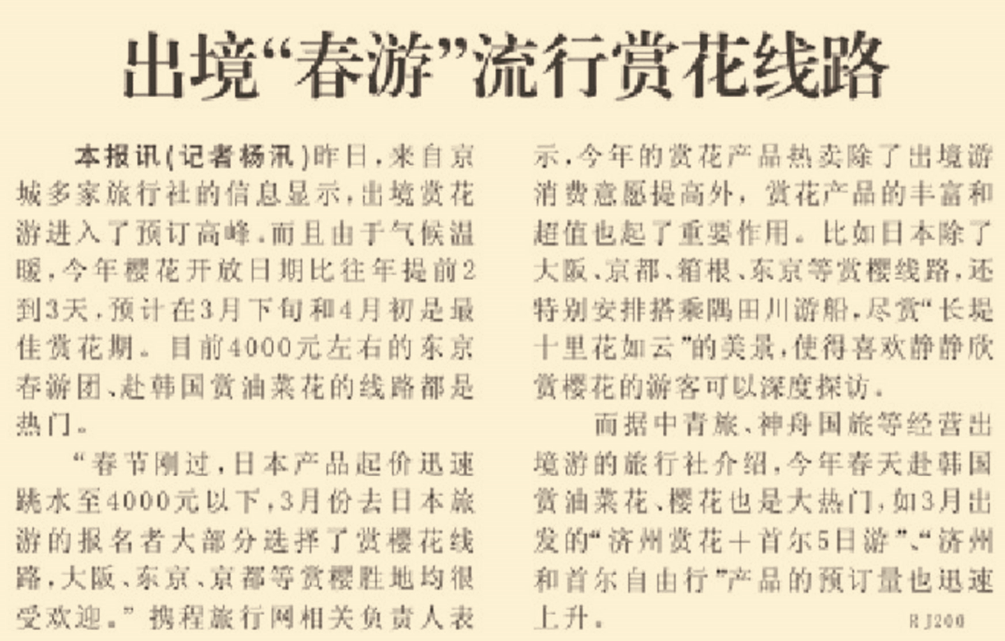 2010年2月25日,《北京日报》6版《出境“春游”流行赏花线路》