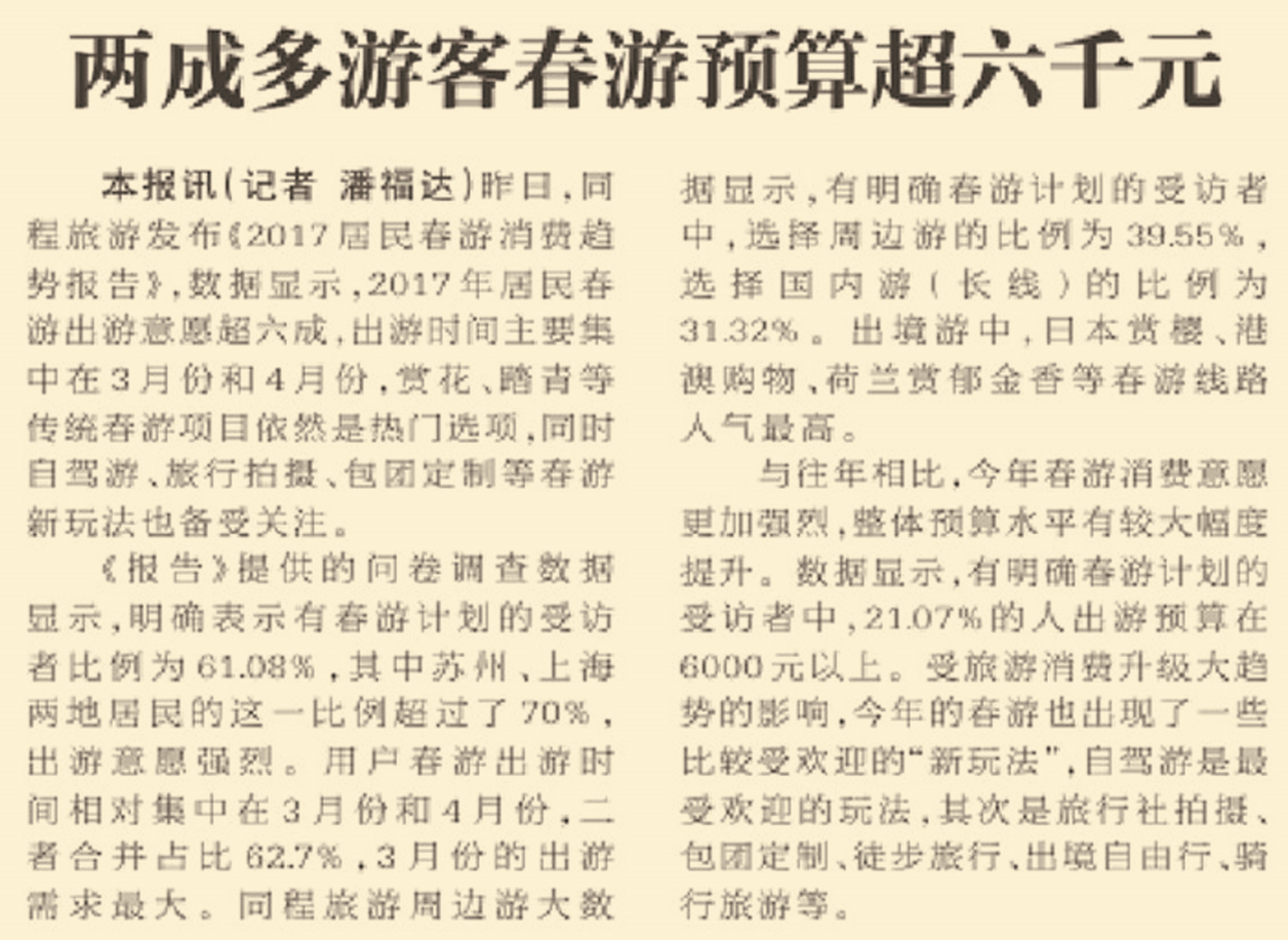 2017年3月4日,《北京日报》11版 《两成多游客春游预算超六千元》