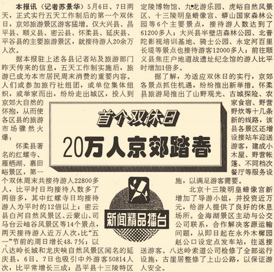 1995年5月6日、7日是正式实行五天工作制后的第一个双休日。那两天,北京城里的人们或和朋友报名参加旅行团,或举家而出,纷纷到京郊春游,使得京郊旅游景区游客猛增。仅大兴、昌平、顺义、密云、怀柔、延庆、平谷的主要旅游景区,就接待游人20余万人次。