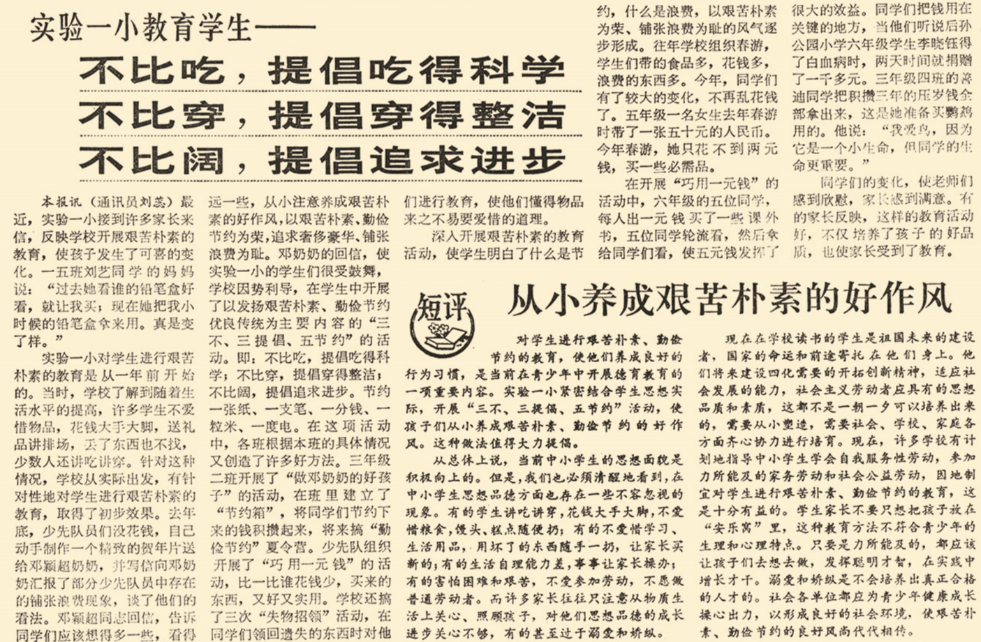 针对这种现象,一些中小学开展了相关的教育活动。像实验一小对学生进行的是艰苦朴素教育,教孩子们不比吃、不比穿、不比阔,倡导节约。往年学校组织春游,学生们带的食品多,花钱多,浪费的东西也多。经过老师们的悉心教育,孩子们有了较大的变化,不再乱花钱了。五年级一名女生头两年春游至少要带50元钱,1988年春游时,她只花了不到两元钱,买了一些必需品。