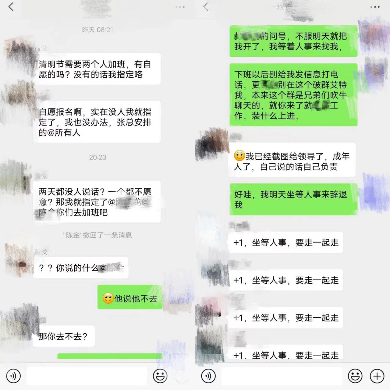 此前聊天截图显示,中国电科(CETC)成都区软件开发事业部的一名员工陈某,拒绝领导强制安排清明节加班,并将自己过去一段时间加班的怨气一并吐出,引起了部门同事的集体共鸣,纷纷向公司表态请辞,当事人陈某疑似已经离职。