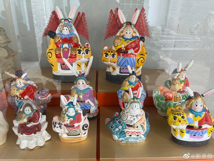 而胡鹏飞手下的兔儿爷脸部圆润,面带笑意,暖滋滋的,形象更趋于人。工艺也有变化。参照凤翔泥塑的经验,胡鹏飞在泥料中分次加入棉花,揉捏起来更有韧劲,成型后不易裂断。