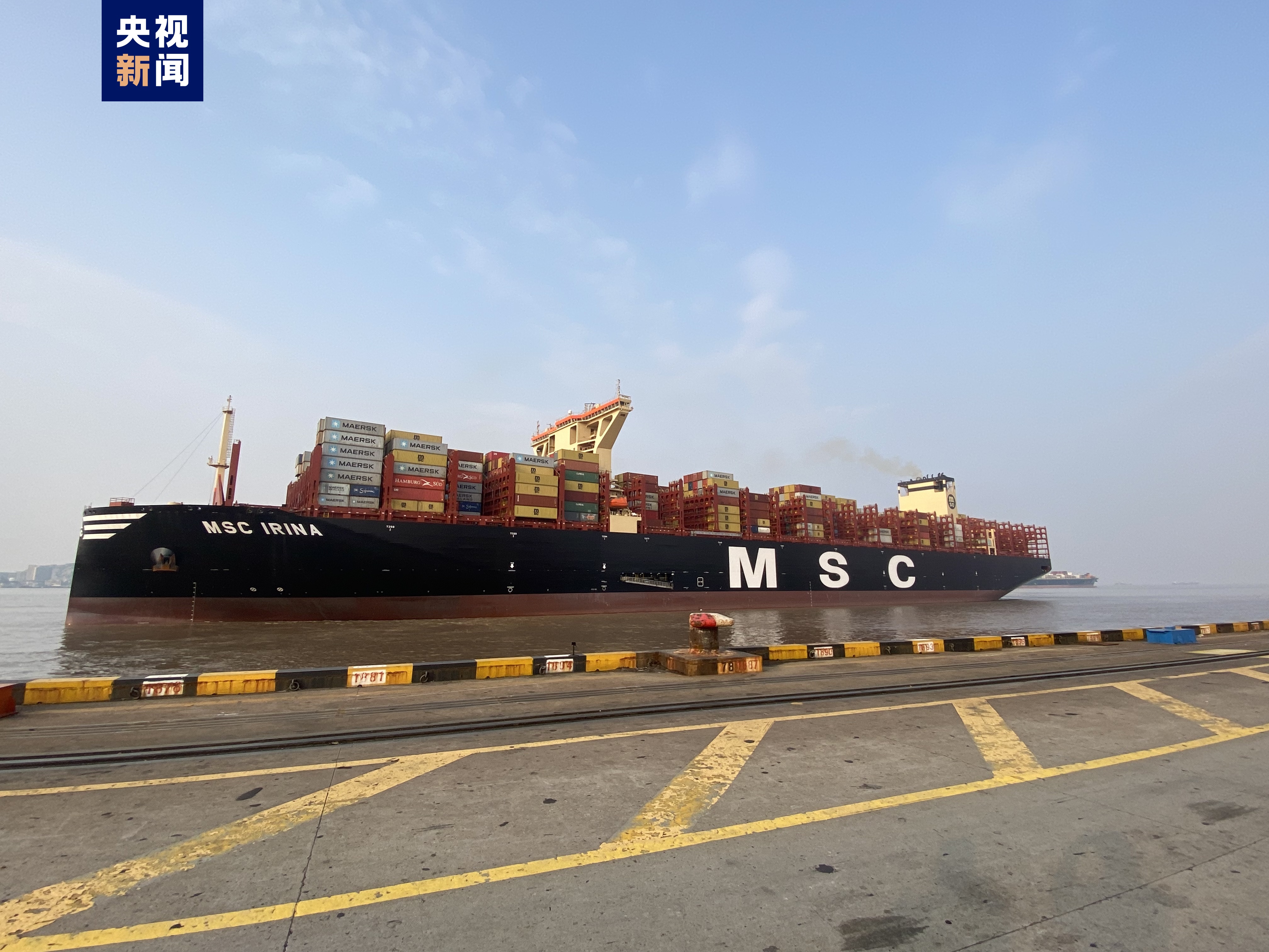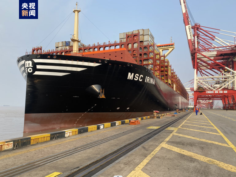 4月6日7时,记者从上海洋山边检获悉,利比里亚籍“地中海伊琳娜”号集装箱轮靠泊洋山深水港三期码头,这艘船舶全长399.99米,型宽61.3米,最大能装载24346个标准集装箱,最高可堆叠22层楼高的集装箱,再度刷新上海洋山深水港靠泊大型集装箱轮的历史纪录。