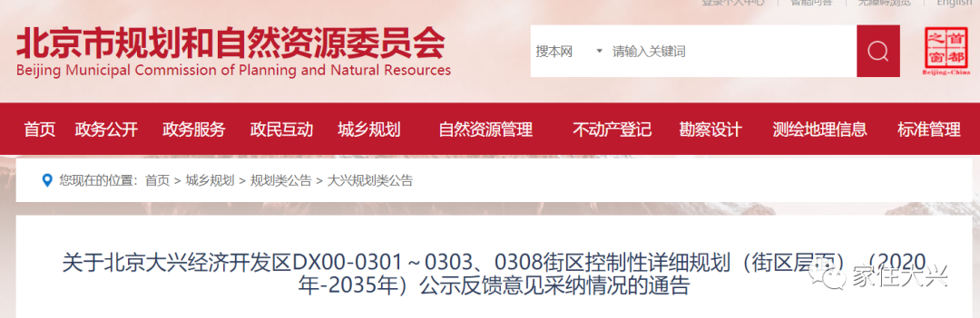 关于北京大兴经济开发区DX00-0301~0303、0308街区控制性详细规划(街区层面)(2020年-2035年)公示反馈意见采纳情况的通告