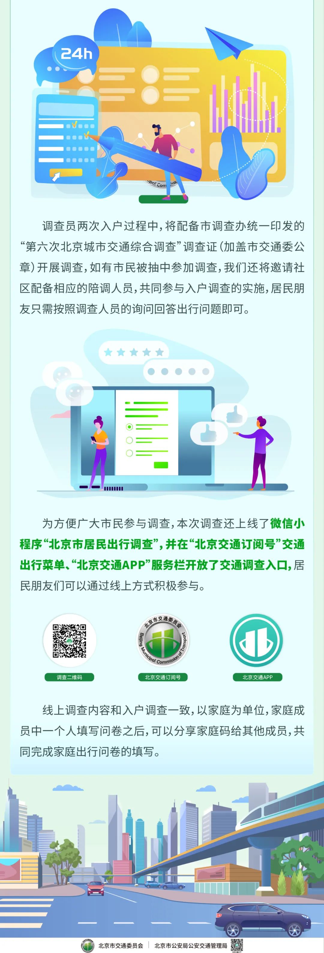 轨道公交接驳换乘调查面向全市乘坐公交、轨道的市民,通过线上方式开展。可通过“北京交通订阅号”、北京交通APP、亿通行及一卡通的推送参与调查。