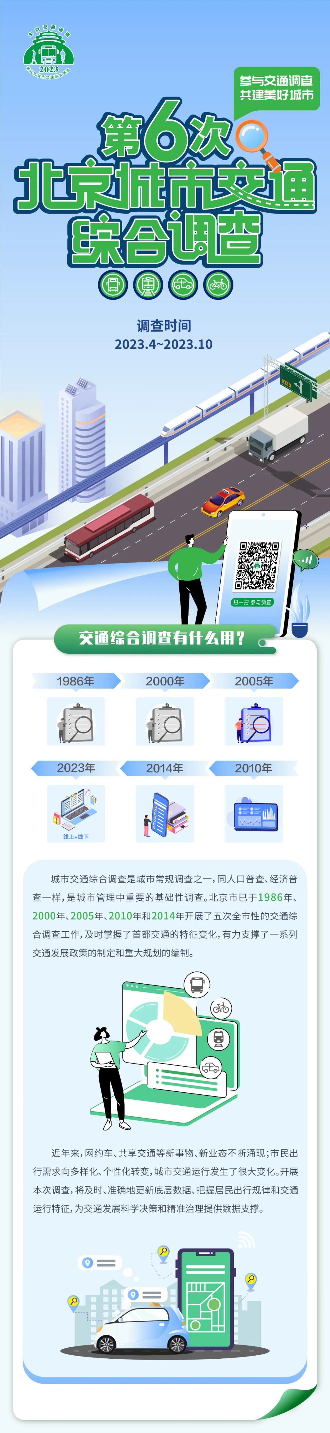 记者从市交通委获悉,为全面摸清城市交通发展现状,及时掌握新时期市民出行特征以及新业态发展状况,2023年4月7日,北京启动第六次城市交通综合调查工作。本次调查面向社会公众开展的调查共8项,采取线上线下结合的方式陆续开展。调查时间为今年4月至10月。