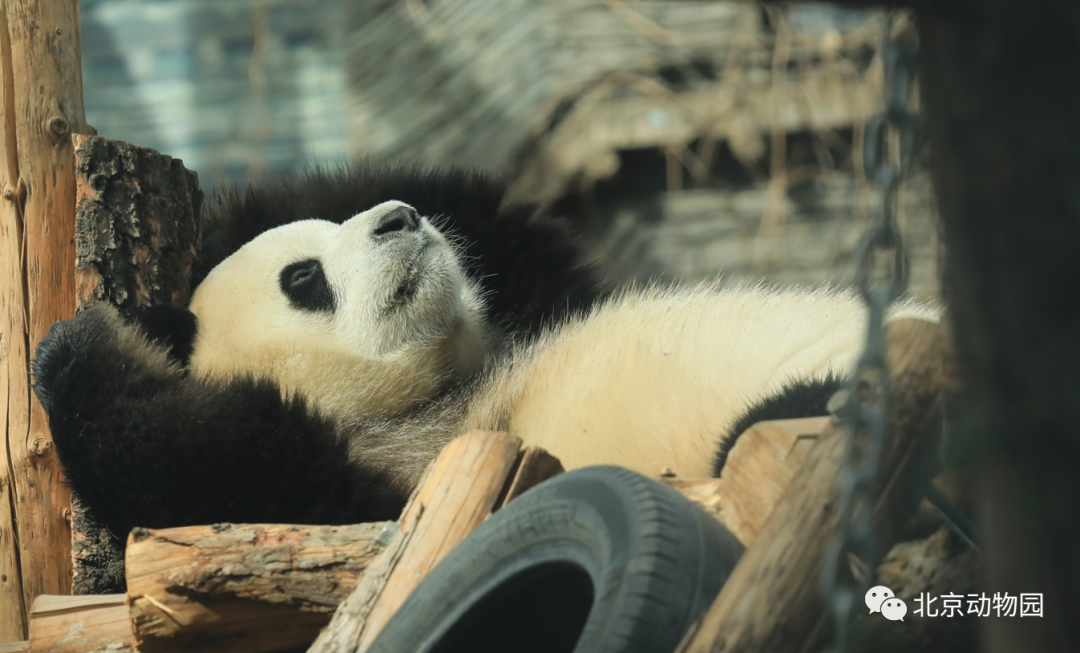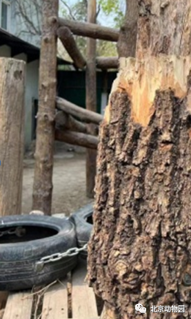 园内整修卸下的柳树树干被工作人员重新利用,“变废为宝”,作为熊猫丰容计划之一投入使用。不仅是大熊猫馆,这些树干在大象、貘馆也得到了充分利用。