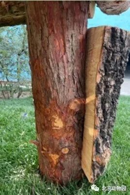 动物饲养保障队的丰容工作人员基于动物在野外有搔痒、标记、抓树、玩耍等自然行为,开发出蹭痒板这一丰容项目。