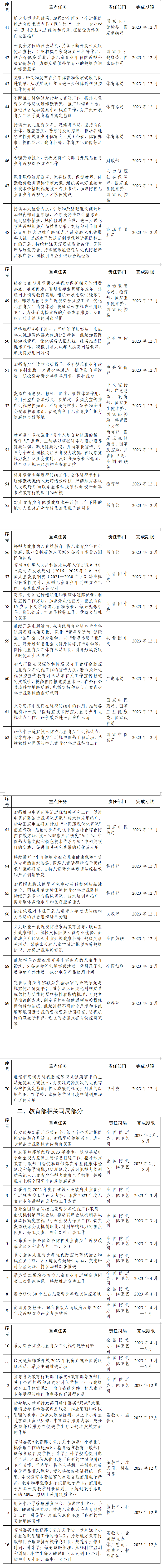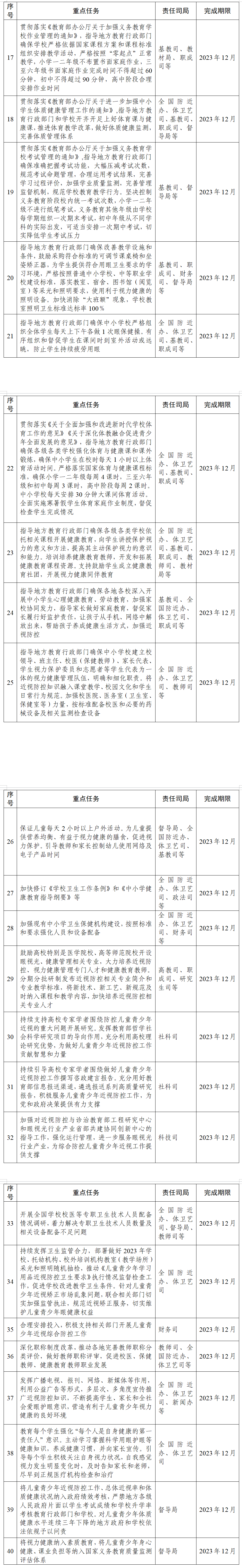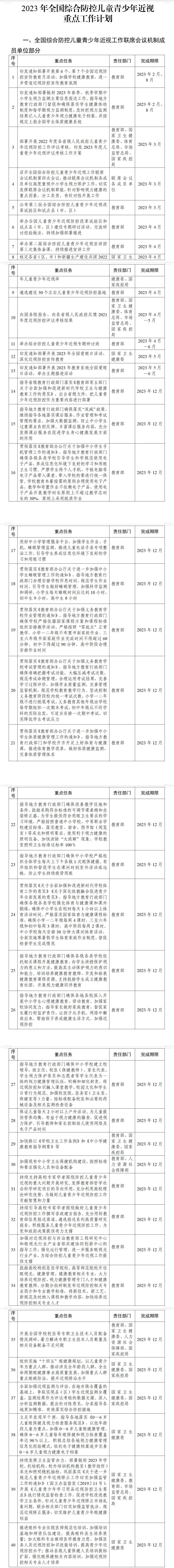 《计划》明确了全国综合防控儿童青少年近视工作联席会议机制16个成员单位2023年重点任务70项和教育部15个相关司局2023年重点任务40项,并明确了完成期限。