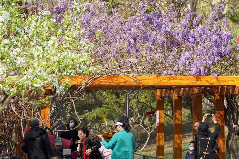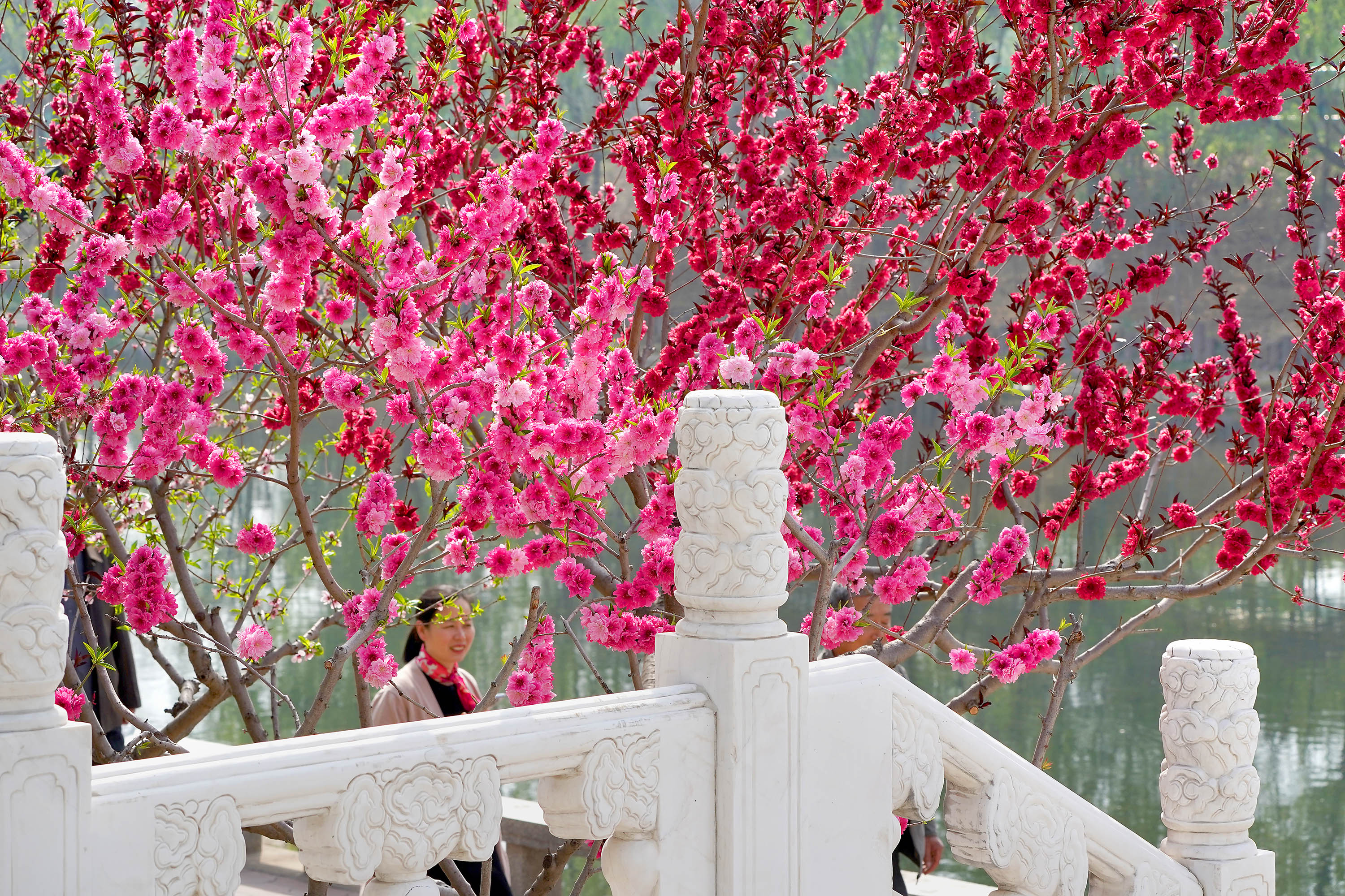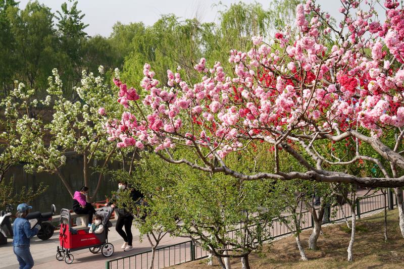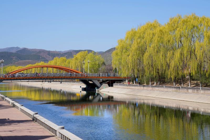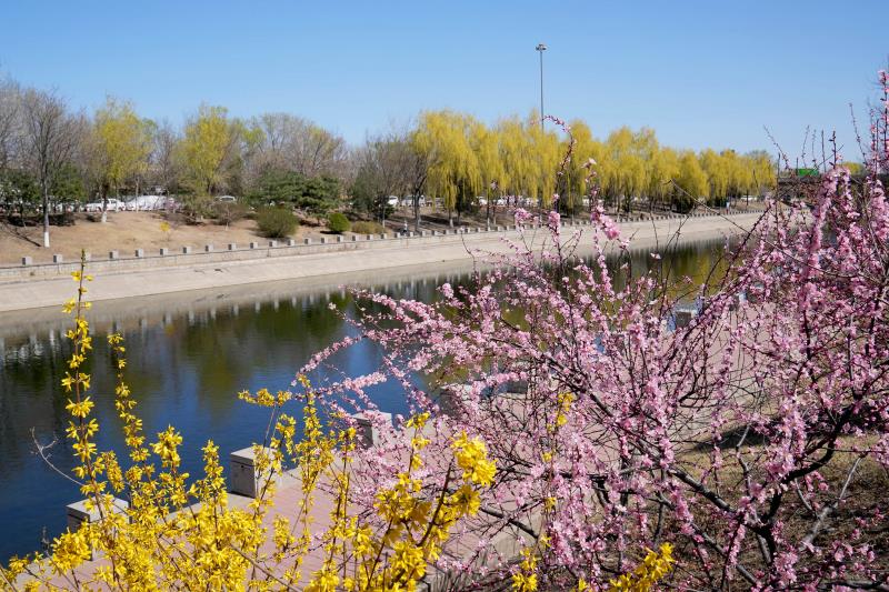 海淀区清河沿岸桃红柳绿,水清天蓝,春意正浓。