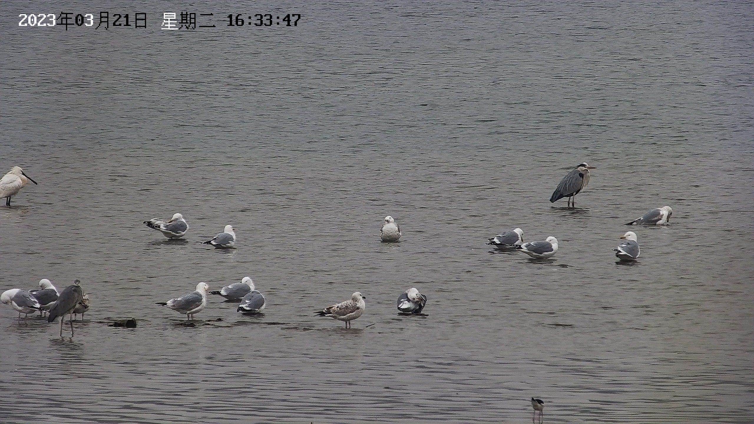 西伯利亚银鸥、苍鹭和白琵鹭在沙河水库“同框”。