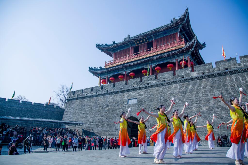 荆州古城历史文化旅游区宾阳楼前,正在举行文化活动。(张梦瑶 摄)