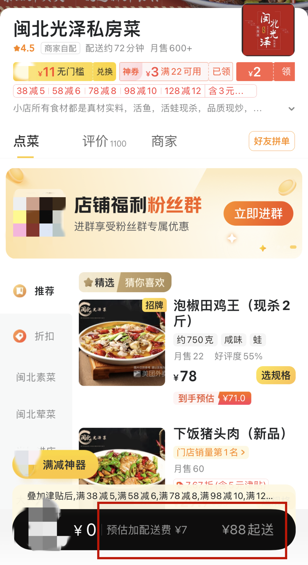 闽北光泽私房菜起送价88元、配送费7元,该店几道菜品标价,大部分均低于88元。记者联系商家询问设置起送价原因,该店工作人员林先生表示,88元起送价是依据配送距离决定的,距离越远价格越高,因为商家要承担更高的配送费,消费者多点几道菜就可达到起送标准,还可以参加“98减10”等满减活动。