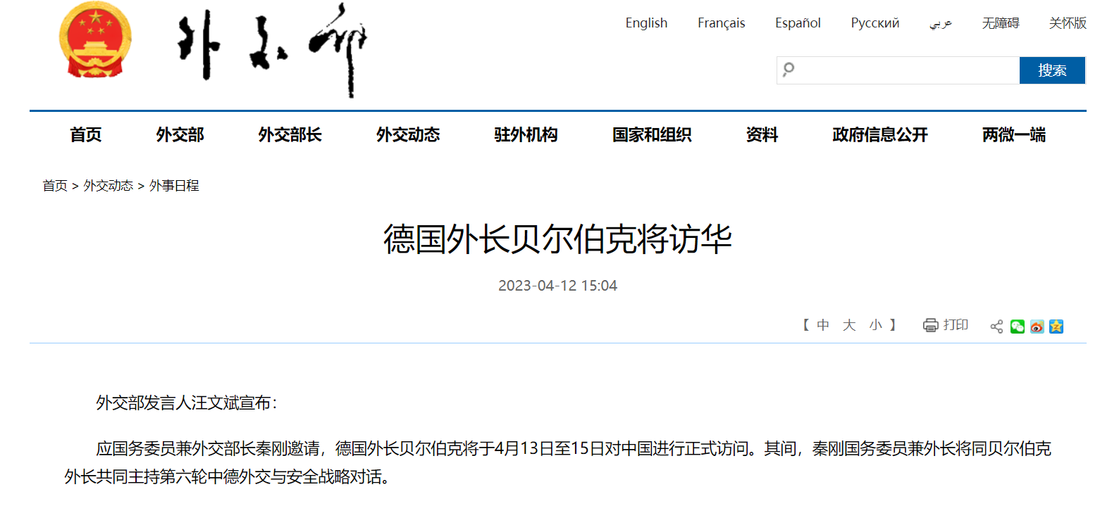 应国务委员兼外交部长秦刚邀请,德国外长贝尔伯克将于4月13日至15日对中国进行正式访问。其间,秦刚国务委员兼外长将同贝尔伯克外长共同主持第六轮中德外交与安全战略对话。