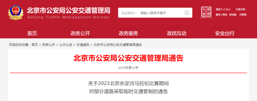 北京市公安局交通管理局发布了《关于2023北京永定河马拉松比赛期间对部分道路采取临时交通管制的通告》。