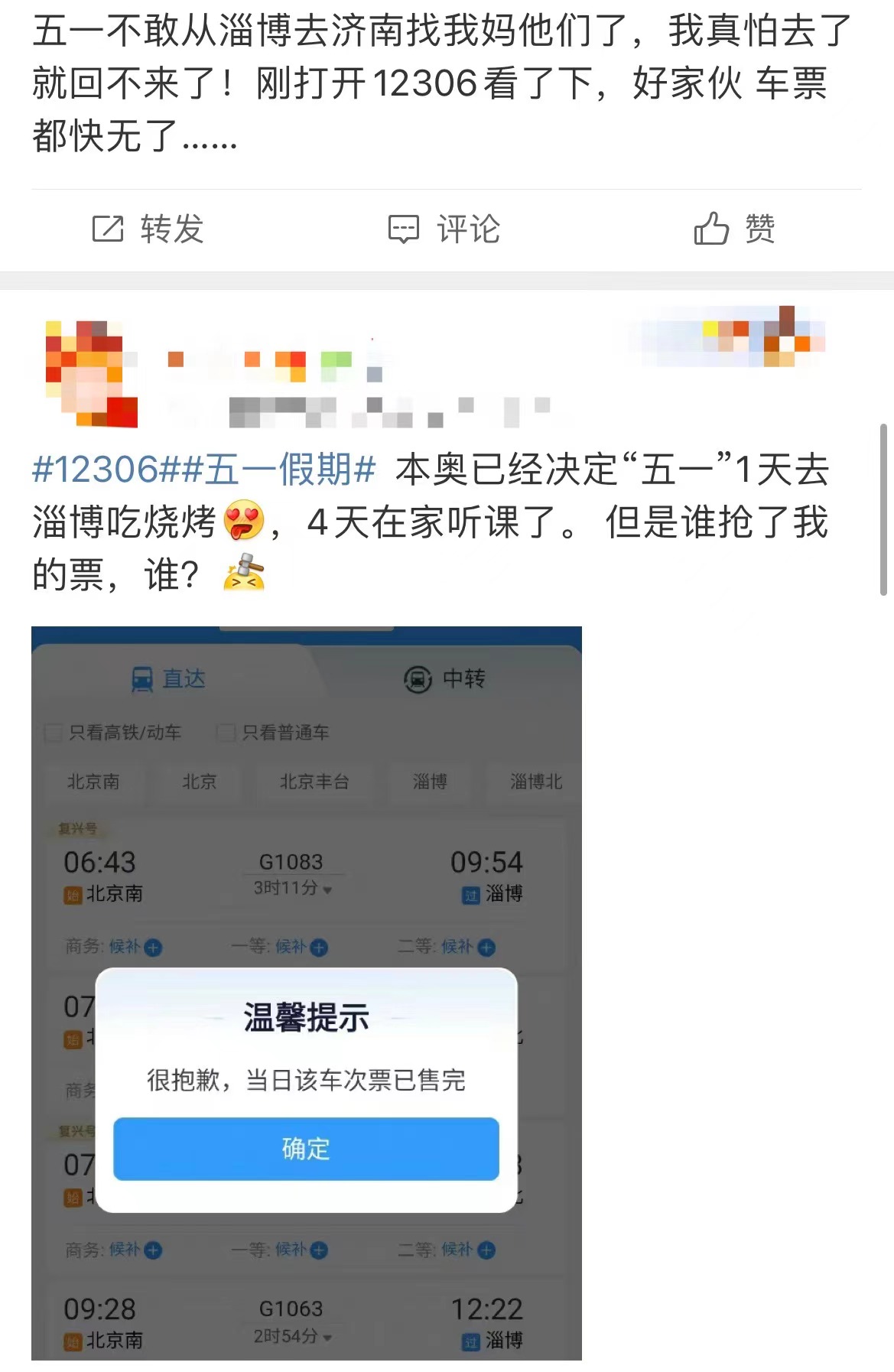 网友评论“在12306上抢不到去淄博的高铁票”