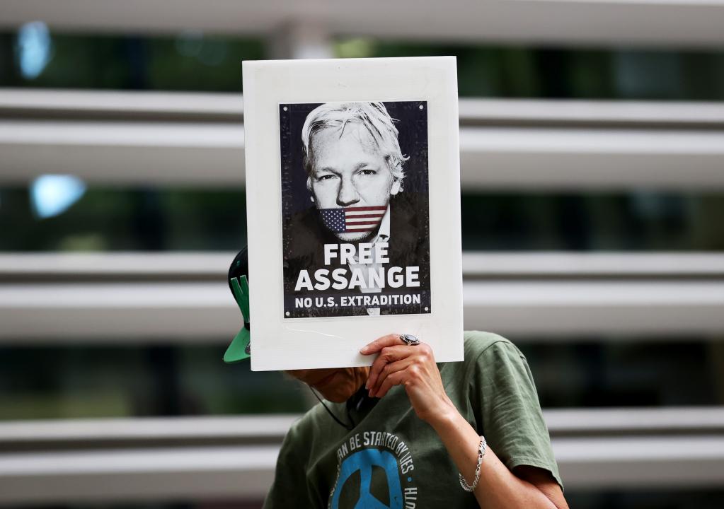 2022年5月17日,一名示威者在伦敦英国内政部大楼门前手举“释放阿桑奇”标语。新华社记者李颖摄