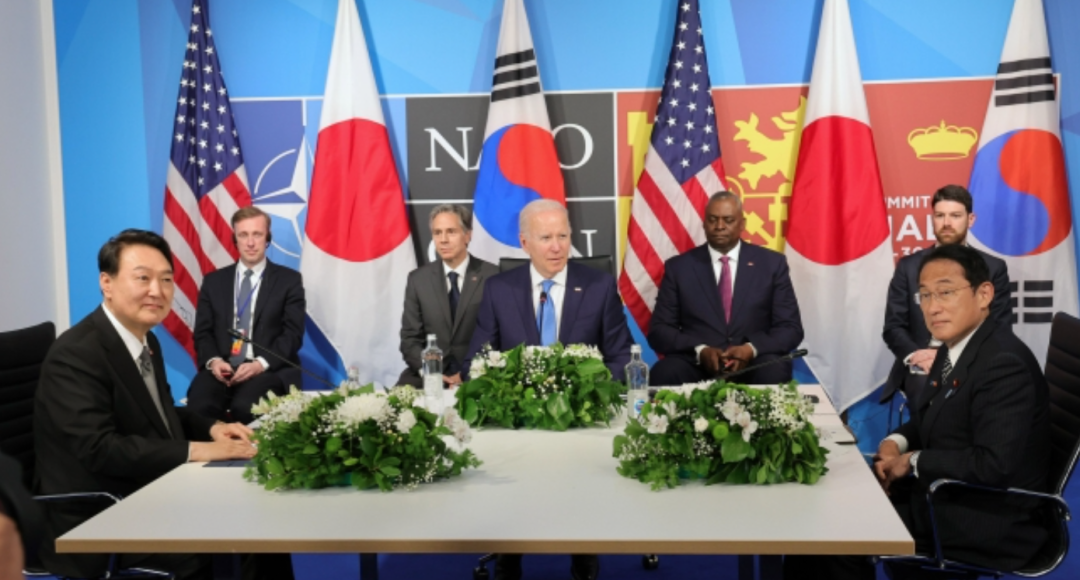 韩美日三国首脑于当地时间2022年6月29日下午在西班牙马德里国际会议场举行首脑会谈。左起为韩国总统尹锡悦、美国总统拜登、日本首相岸田文雄。图源:韩媒