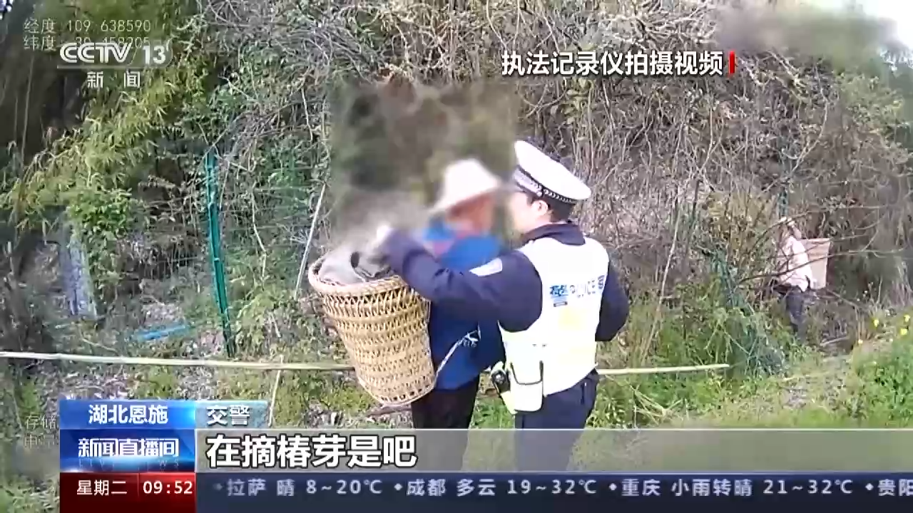 近日,湖北恩施高速交警在辖区内高速公路巡逻时,发现有两名行人正在路旁山坡上,他们背着背篓,手里还拿着长长的竹竿。