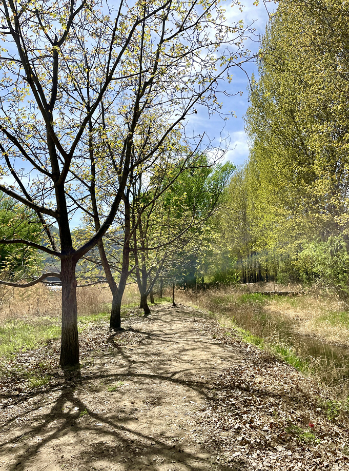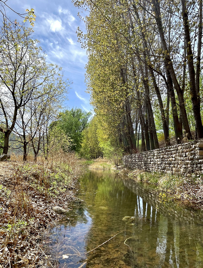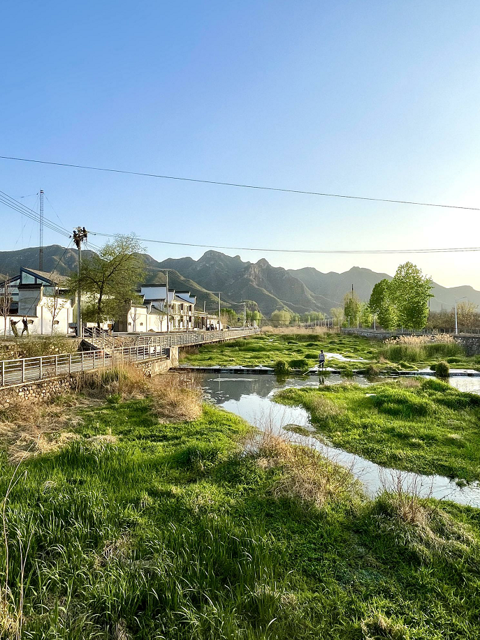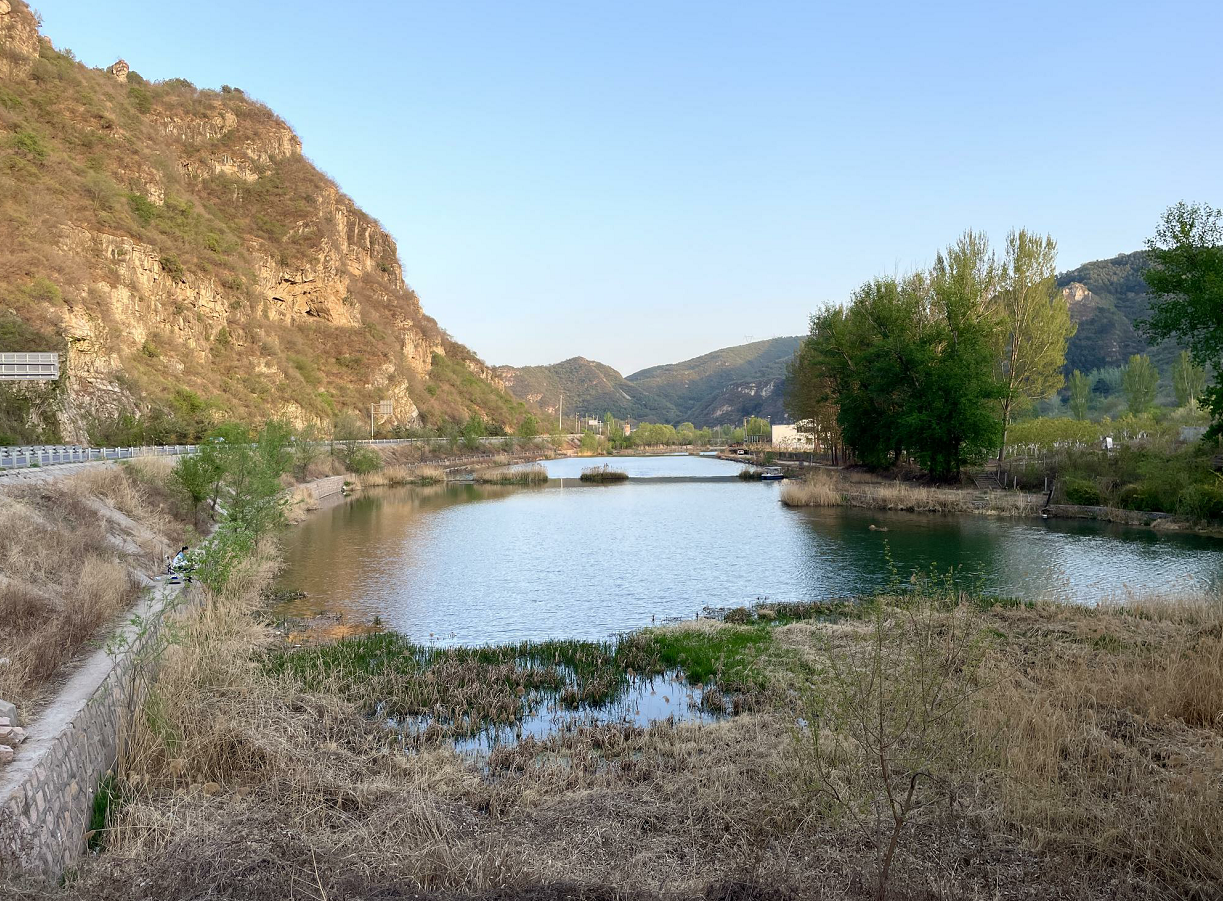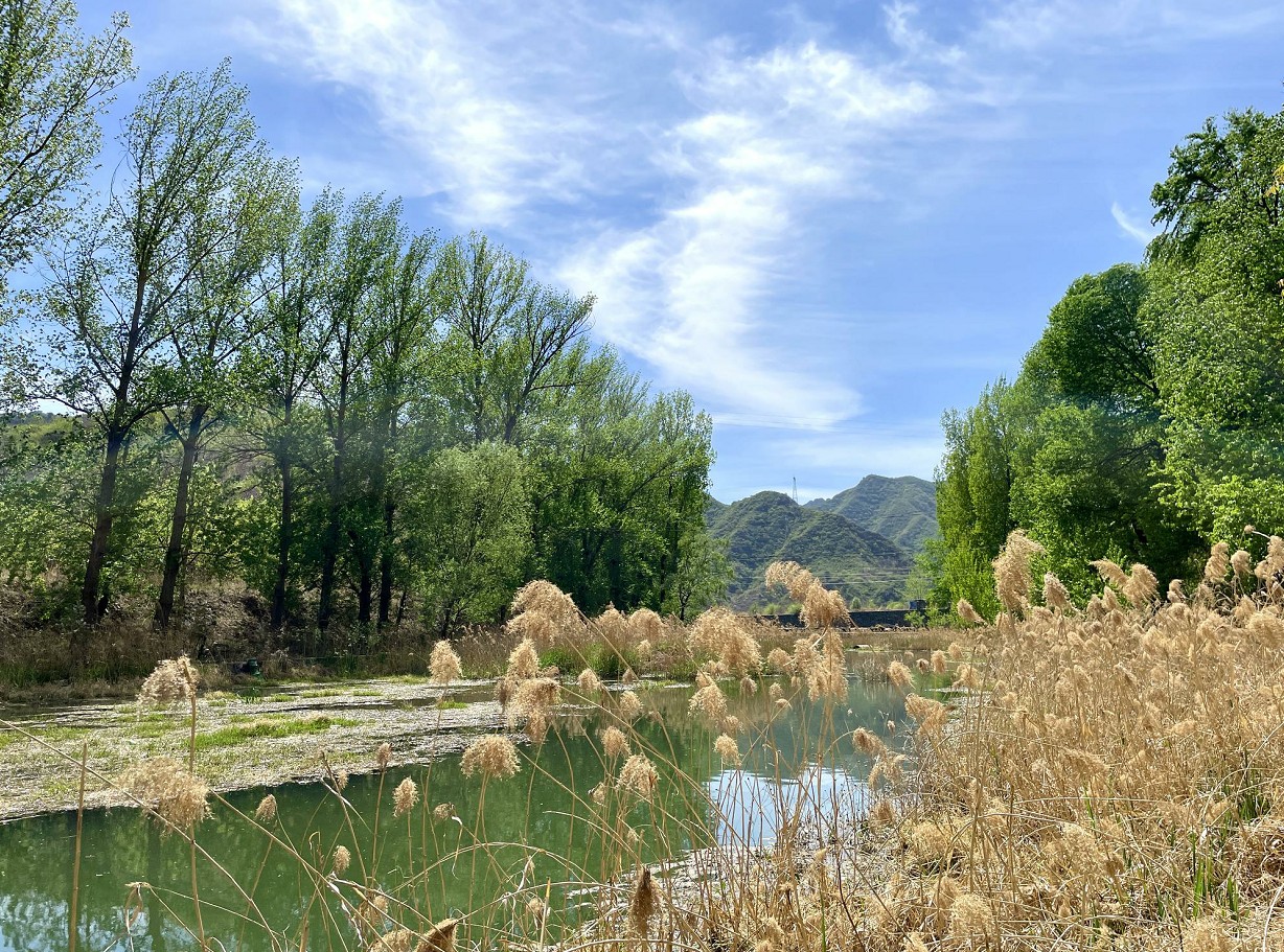 今日天空湛蓝,空气质量转优。沿着怀柔区怀长路一路向西,可见两侧春花盛开,绿树成荫。路旁穿林而过的怀九河两岸植被茂密,少了几分人气,多了几分自然。通透的蓝天、碧绿的河水、嫩绿的新叶,美成了童话世界。