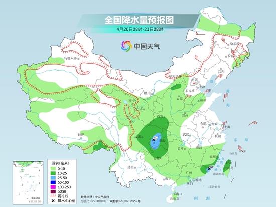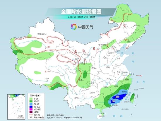 今天,雨带南移并迅速缩减,广东、福建等地部分地区有暴雨或大暴雨。具体来看,今天,新疆南疆盆地西部、内蒙古东北部、黑龙江西北部等地部分地区有小到中雪或雨夹雪;西藏东南部、江南中东部和南部、华南中北部、台湾岛大部等地部分地区有中到大雨,其中,江西南部、福建南部、广东中东部等地部分地区有暴雨或大暴雨。