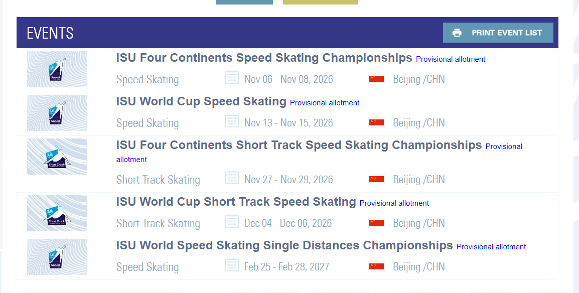2026-2027赛季:2026年11月6日至8日,国际滑联速度滑冰四大洲锦标赛;2026年11月13日至15日,国际滑联速度滑冰世界杯第一站;2026年11月27日至29日,国际滑联短道速滑四大洲锦标赛;2026年12月4日至6日,国际滑联短道速滑世界杯第三站;2027年2月25日至28日,国际滑联速度滑冰单项世界锦标赛。