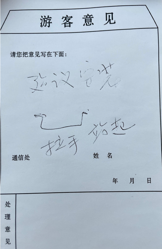 给普通厕位安装扶手,也是一些游客的建议。在北海公园南门卫生间,有一本挂在墙上的意见簿。游客意见中,有人写下“建议安装拉手站起”,还附上了简单的手绘示意图。处理意见一栏,暂时没有园方答复。记者拨打了北海公园的服务热线,工作人员答复称已收到这项提议,会跟相关部门沟通。如果可行的话,尽量为老人加装扶手。
