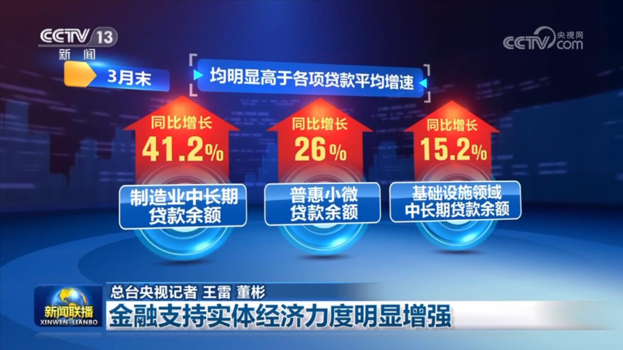 一季度,新增贷款主要投向制造业、基础设施业、服务业等领域。3月末,制造业中长期贷款余额同比增长41.2%,普惠小微贷款余额同比增长26%,基础设施领域中长期贷款余额同比增长15.2%,均明显高于各项贷款平均增速。