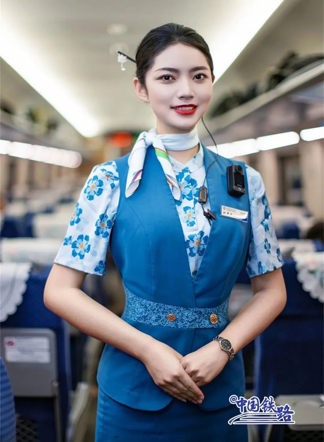 身穿的蓝色乘务制服