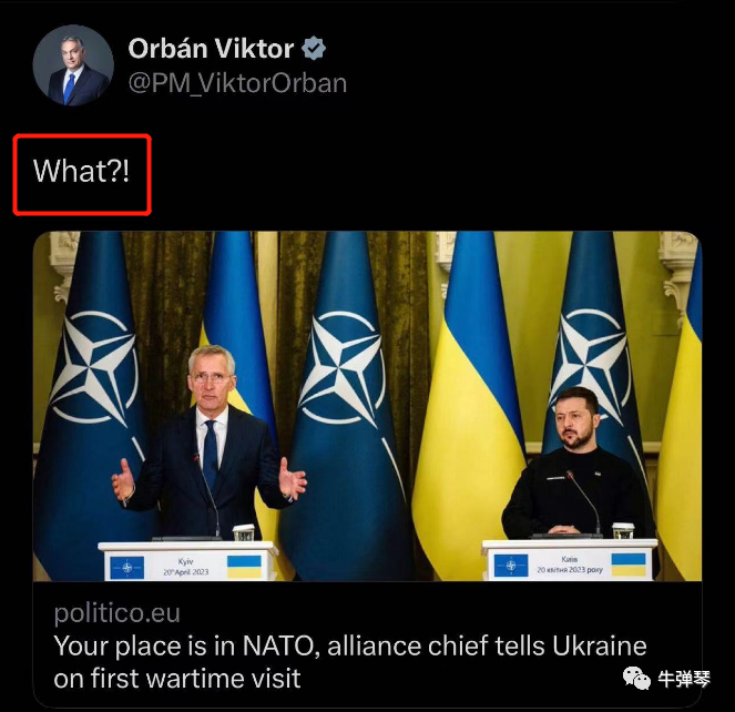 很简单,看到斯托尔滕贝格的这个表述,匈牙利总理欧尔班立刻就发了一个单词:What(什么),然后是一个问号和一个叹号。