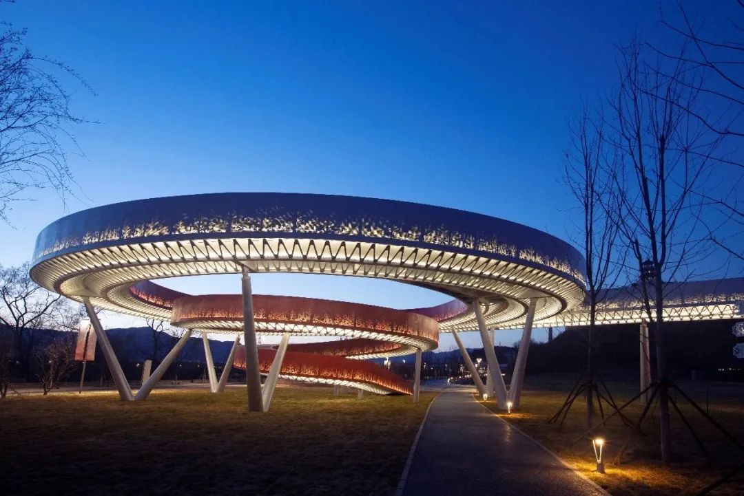 自首钢高线公园末端,通过钢桁架天桥跨越香格里拉酒店及新丰沙铁路线,以“冬奥之环”无障碍链接至永定河左岸公共空间园路内,打造步道新地标。“冬奥之环”顶部银色环形钢圈科技感十足,中间红色阶梯如彩带般环绕而下,绘就了艺术字体的“冬”字式样,刚柔并济、相得益彰。“冬奥之环”和与之相连的高线公园串联起冬奥公园和首钢园,实现了生态园林与工业遗存的完美交融。