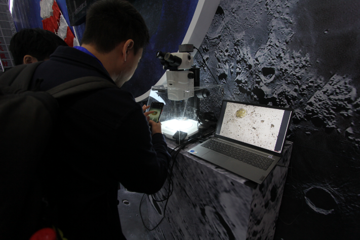 观众欣赏通过显微镜放大的月球样品
