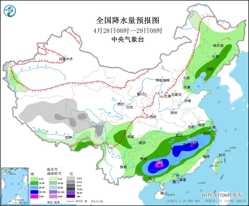 4月28日08时至29日08时,新疆南疆西部山区、西藏北部和东部、青海西部、川西高原北部、内蒙古东北部等地部分地区有小到中雪或雨夹雪;贵州东南部、湖南东部和南部、江西大部、浙江西南部、福建西部和北部、广西中北部、广东西北部等地部分地区有大到暴雨,其中,广西东北部、江西东部等地部分地区有大暴雨(100~130毫米)。西北地区东部、内蒙古、华北西部和北部等地部分地区有5~7级风。渤海海峡将有4~5级、阵风6级的偏南风转6~7级、阵风8级的西北风(见图3)。