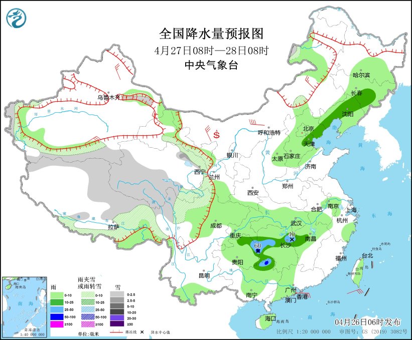 4月26日08时至27日08时,新疆沿天山地区和南疆西部山区、西藏南部和东部、青海南部、甘肃河西、川西高原北部等地部分地区有小到中雪或雨夹雪;新疆南疆盆地西部、西藏东南部、甘肃河西、陕西北部、内蒙古中部、吉林东部、辽宁中东部、华北北部、四川中东部、重庆大部、贵州中北部、云南东部、湖南西北部、湖北西南部、海南岛、台湾岛等地部分地区有小到中雨。新疆北部、西北地区东部、内蒙古中西部、黑龙江东部等地部分地区有4~6级风,其中,新疆东部等地部分地区有6~7级风(见图1)。台湾海峡、巴士海峡、台湾以东洋面将有6~7级、阵风8级的风。